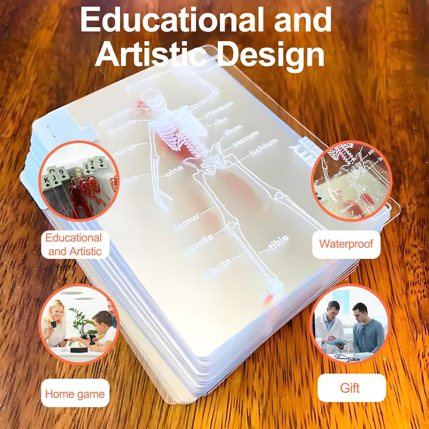 Each card is double-sided, featuring detailed skeletal diagrams with clear English labels. The transparent design makes bone structures immediately clear, turning learning into an intuitive and engaging experience. From the skull to the phalanges, master the entire skeletal system with one deck.
